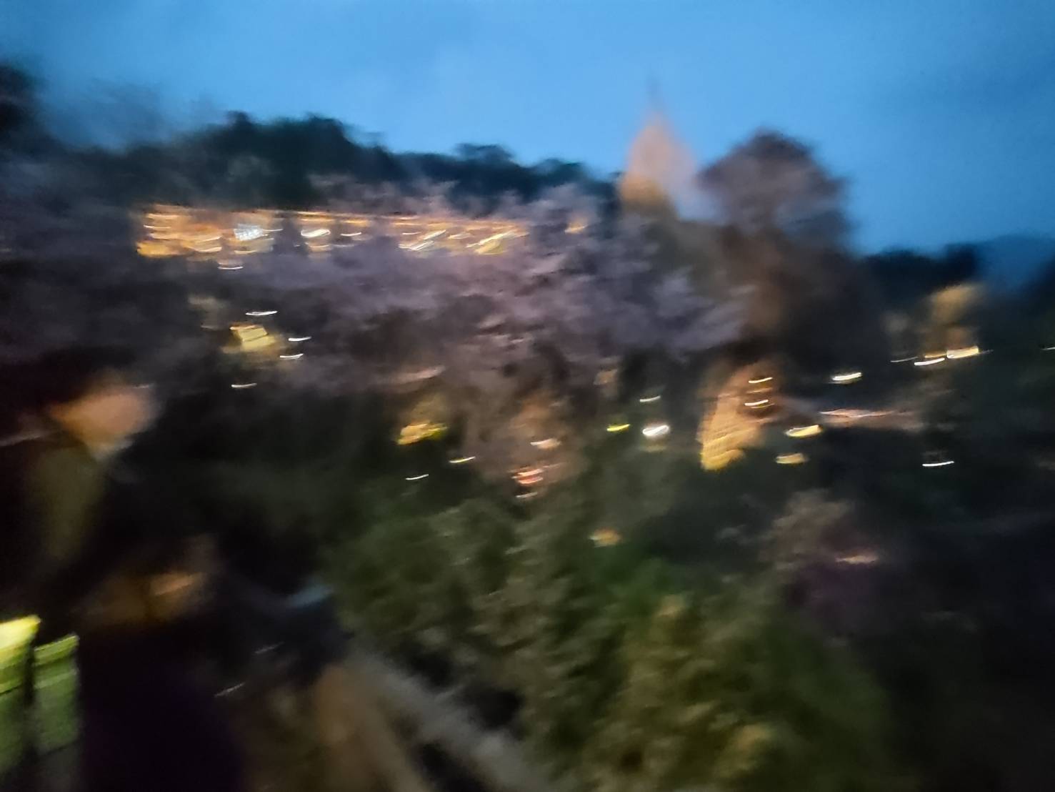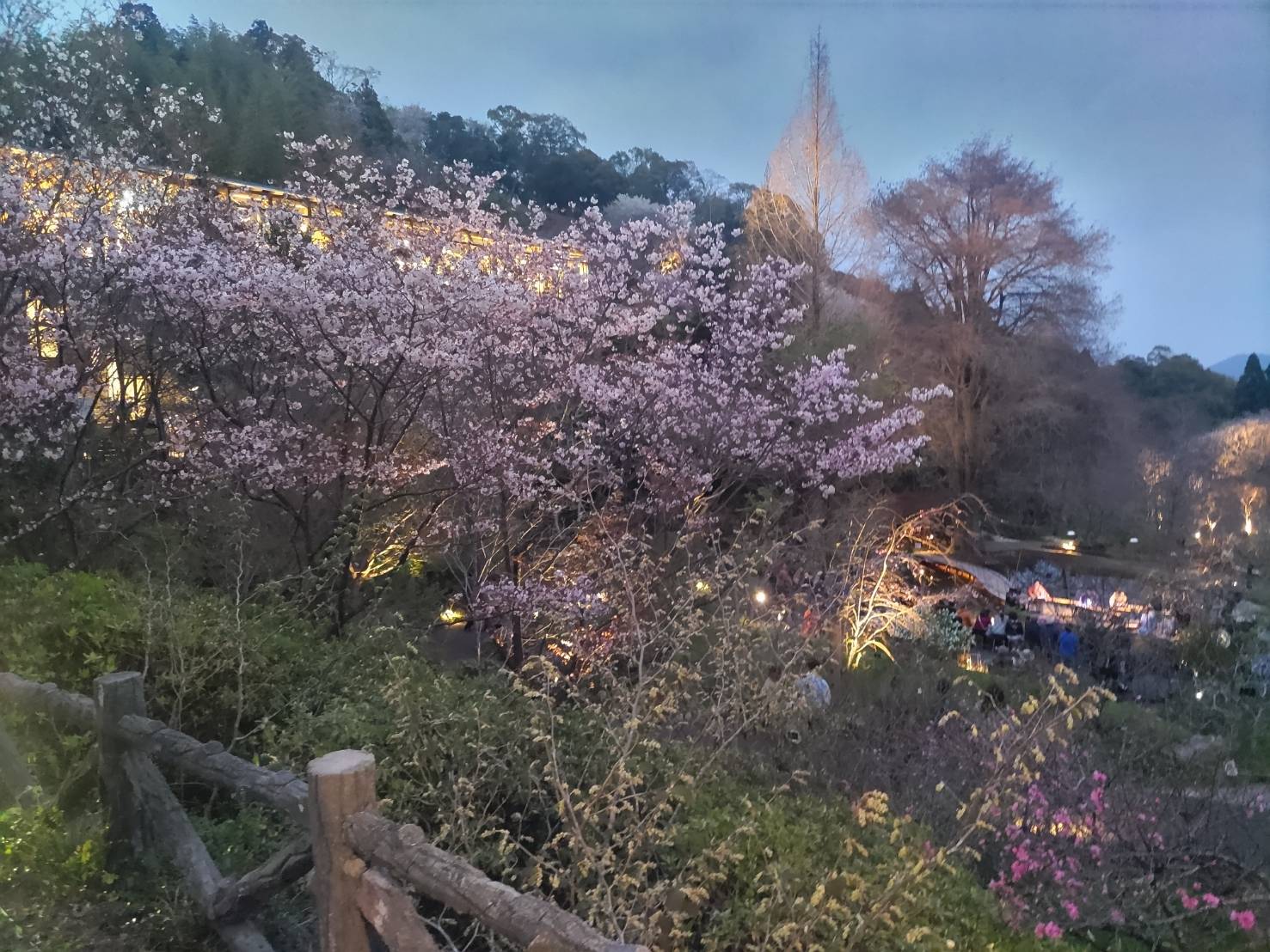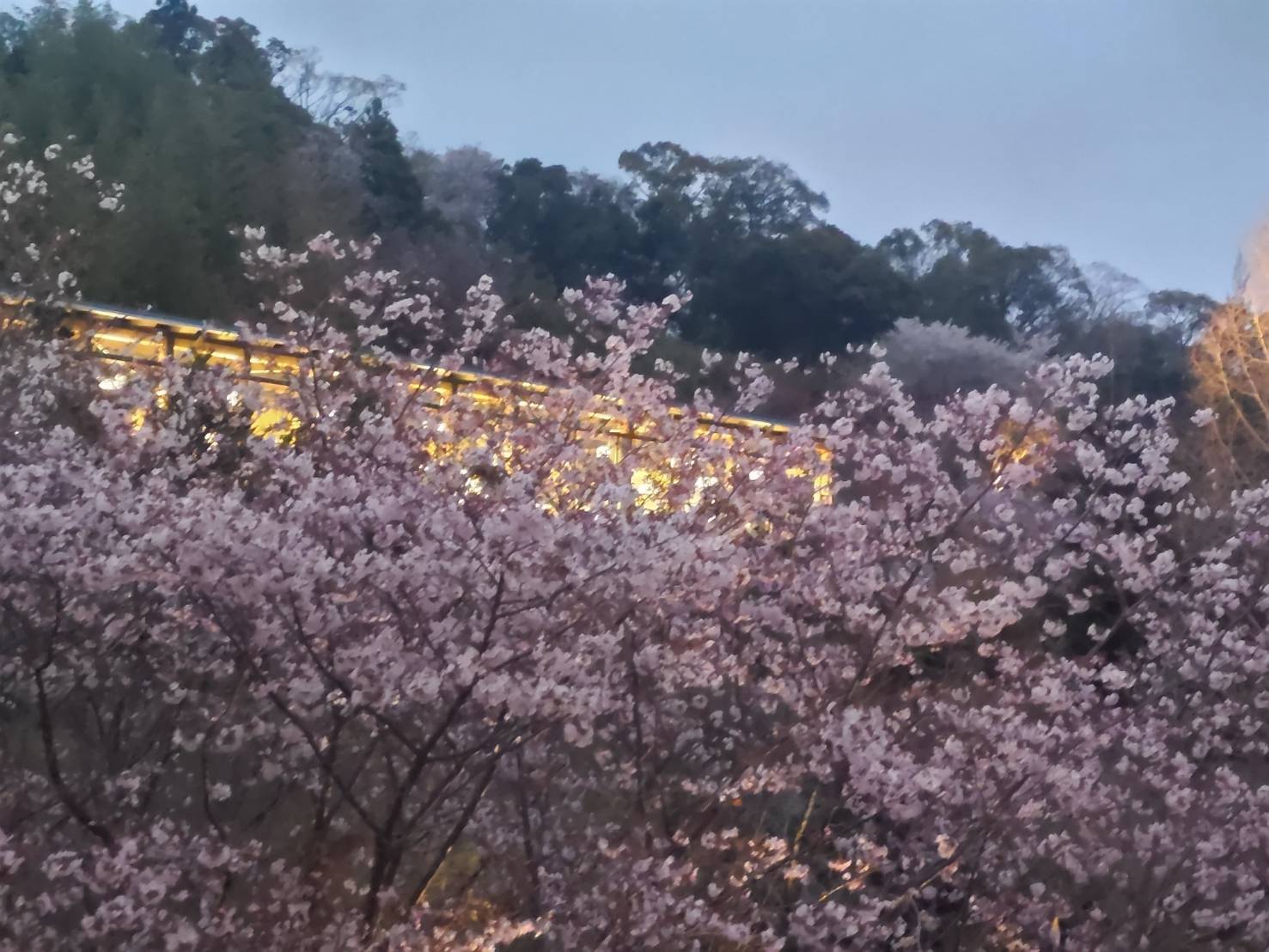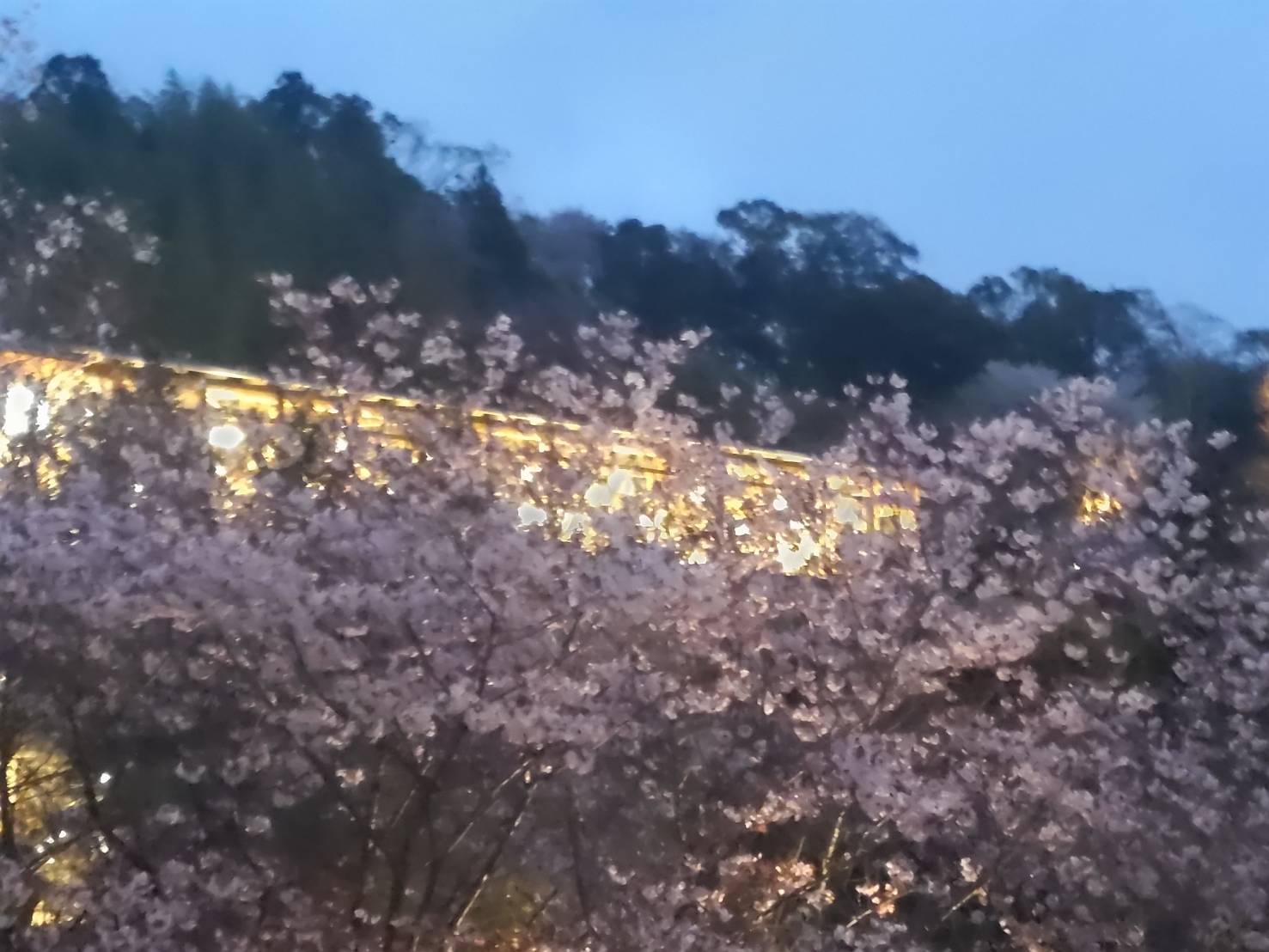 五台山の借景が美しいレストランで軽い夕食を取り、園内の赤い毛氈が敷かれたベンチに陣取って、暫し春の宵を楽しむ。春の風、花の香り、蛙の鳴き声・・・ 眼下の野外ステージからは箏と尺八の音が聞こえ、夜空を見上げると十日余りのおぼろ月がかかっていた。夜が更けるにつれ、あちこちにライトが灯っていき、夜桜の神秘的な美しさが増していく、正に東山魁夷の「花明り」の世界だ。なんと幸せな私!今宵も喜寿の祝福が続いている….。