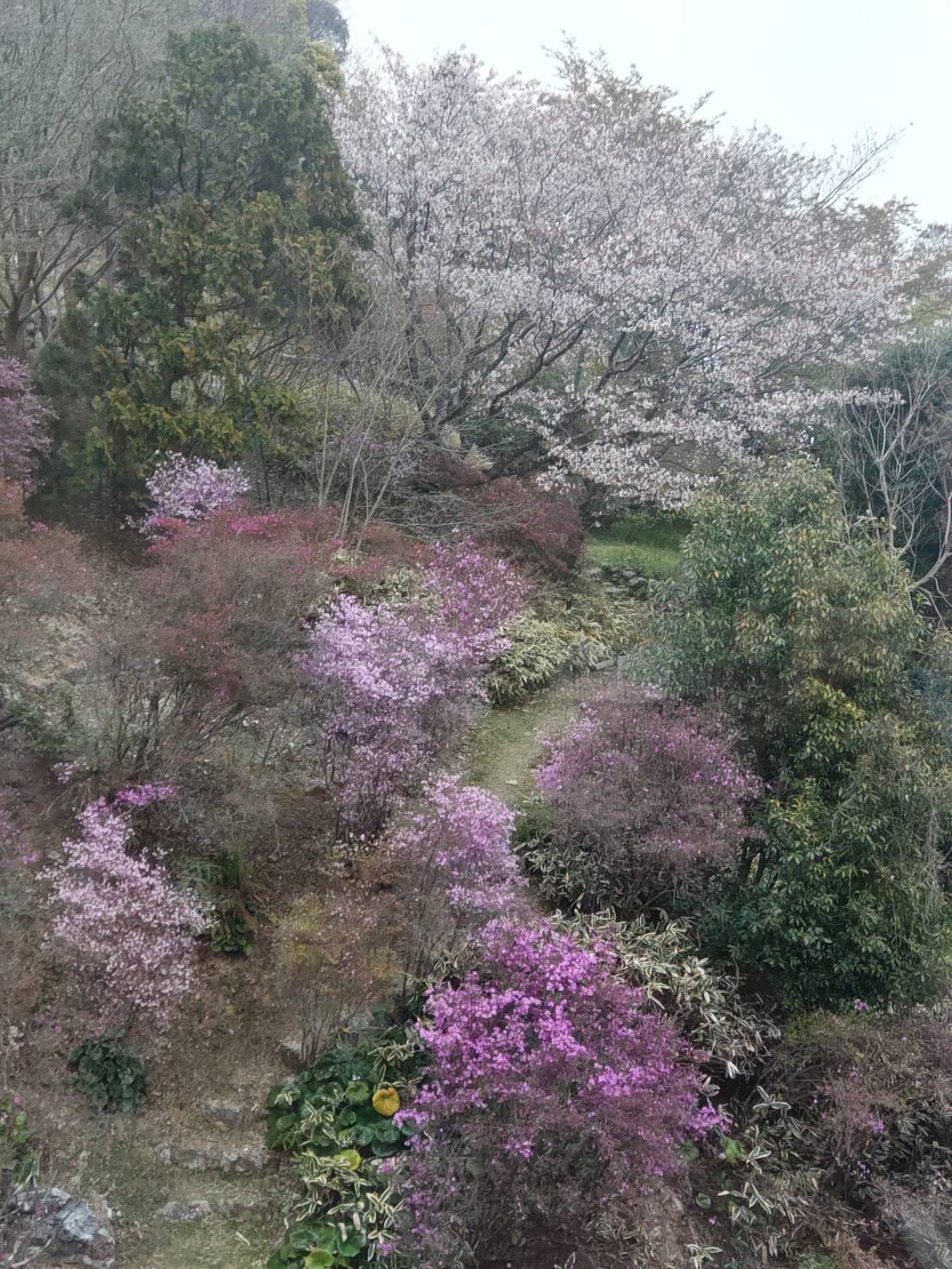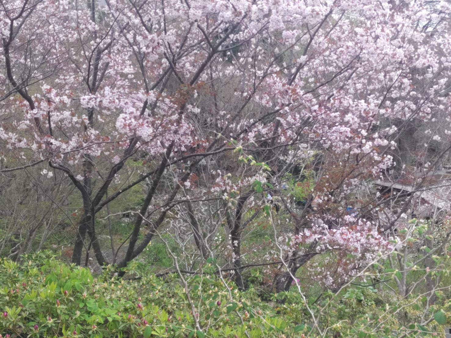 市内から僅か30分足らずで、バスは自然豊かな五台山の山中へ。あちこちに桜が咲いている! 心は期待に膨らむ。