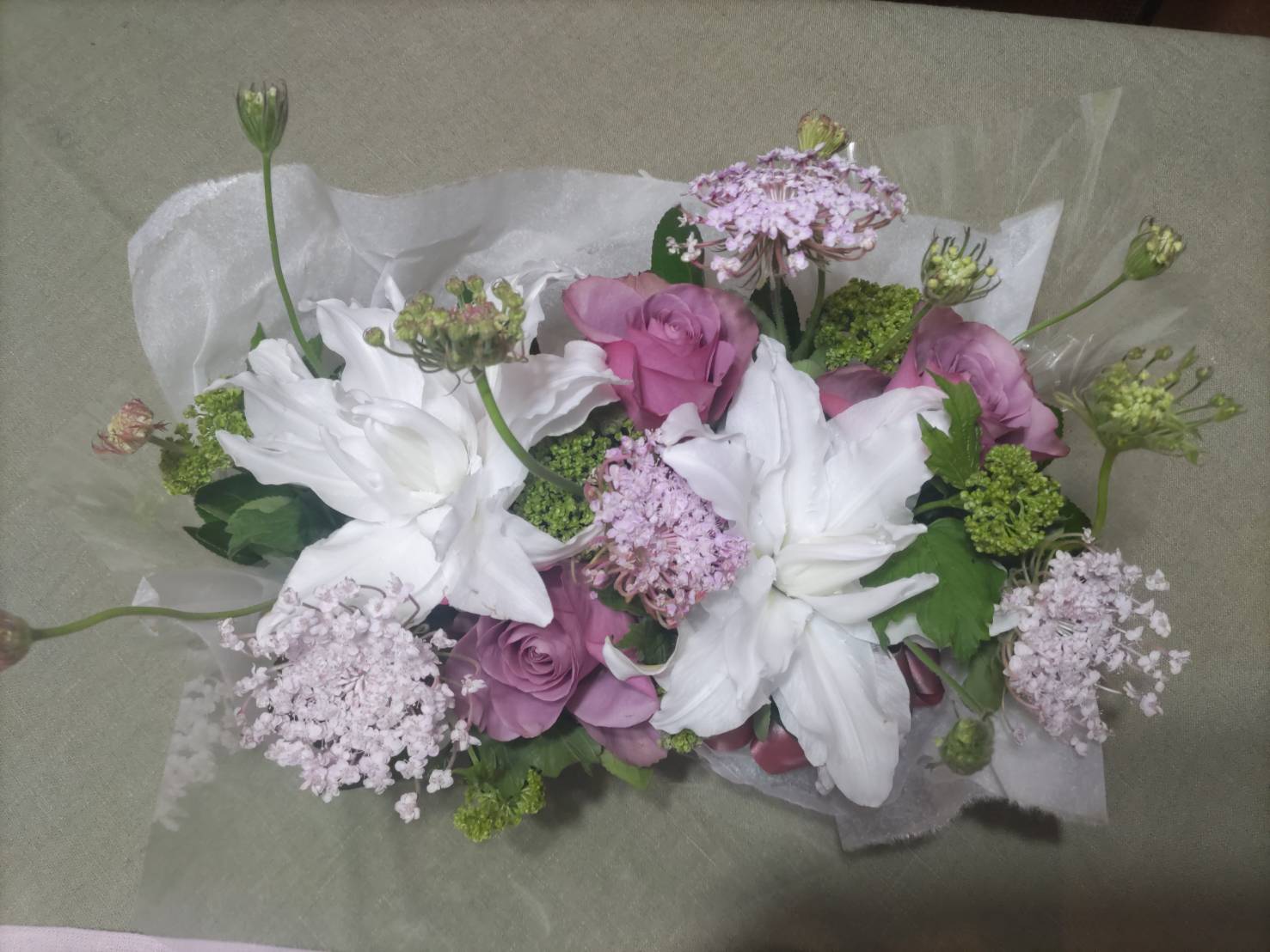 💎百合、レースフラワー、バラ、ビバーナム、マサキのアレンジフラワー